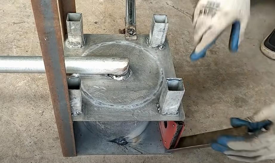 Из квадратной трубы вырезают 4 ножки, которые привариваются к обратной стороне пластины. На торце короткого фрагмента трубы устанавливают заглушку с предварительно высверленными отверстиями. Теперь можно приступить к процессу сборки.