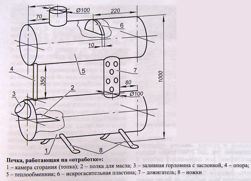 Согласно чертежу печки на отработке, для изготовления камеры дожигания используется труба диаметром 352 мм, высотой 100 мм. В нижней и верхней ее частях выполняются отверстия размером 100 мм. Первое предназначено для трубы камеры сгорания, а второе – для дымохода. Ближе к дымоходному отверстию необходимо приварить перегородку высотой 70 мм, шириной 330 мм.