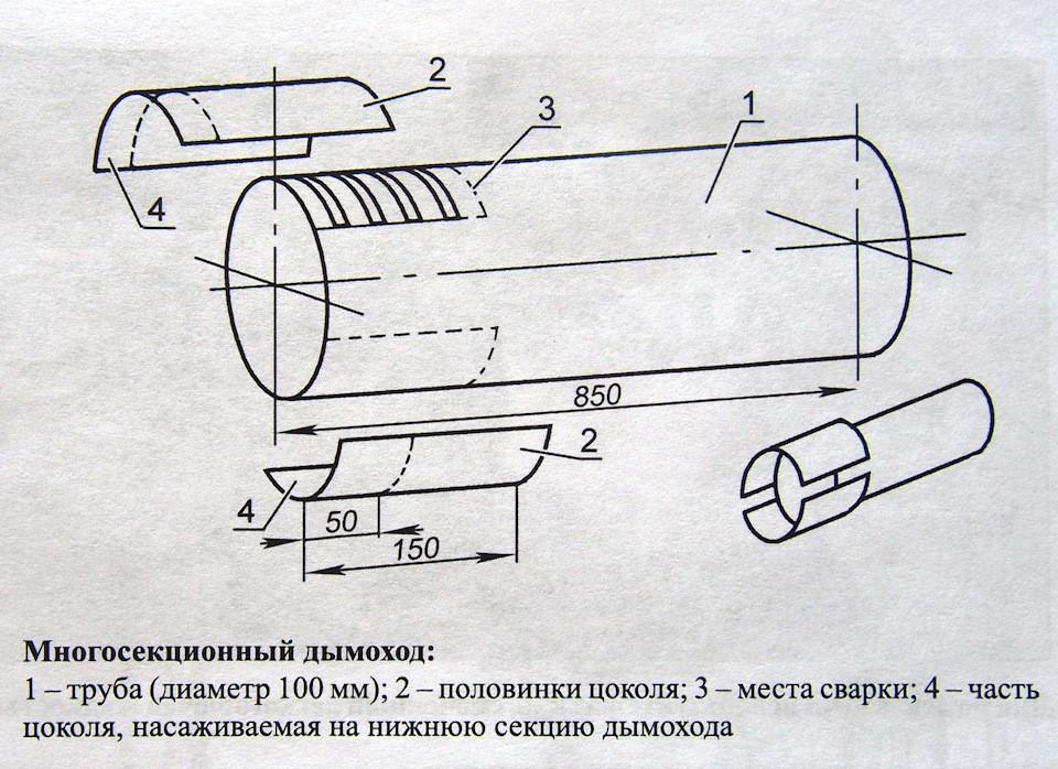 Дымоотводная конструкция выполняется из трубы диаметром 100 мм. Один ее конец приваривается к отверстию в центральной верхней части корпуса, а другой выводится на улицу.