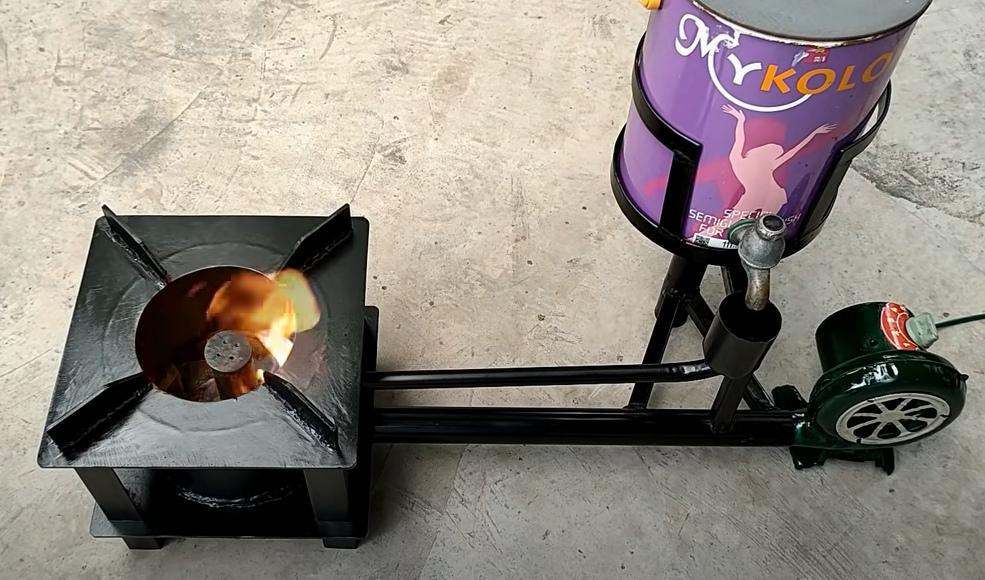 К воздуховоду приваривают специальную подставку, на которой будет установлен сосуд с растительным маслом. Емкость лучше брать из металла или пластика. В нее должен быть вмонтирован кран для регулирования подачи масла. После этого производят установку трубы с горловиной. По ней будет происходить подача масла в камеру горения. Печь готова. Остался только декоративный этап.