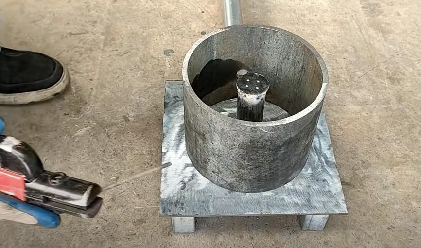 Берут кусок круглой трубы диаметром 16 см и длиной 13 см. Это будет корпус печки. Его приваривают к стальной пластине, которая, как уже понятно, является дном агрегата. Необходимо проследить, чтобы вертикальный фрагмент воздуховода пролегал точно по центру.