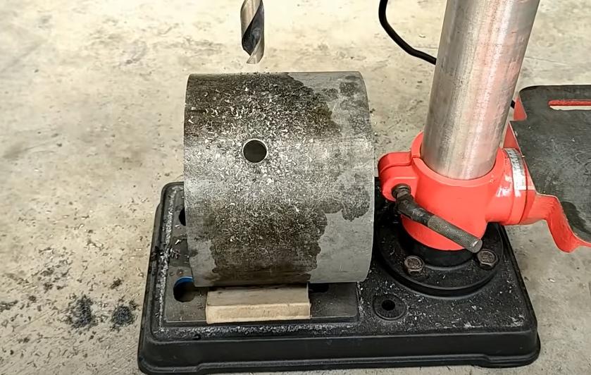 Для изготовления корпуса используется пустой газовый баллон. На нем необходимо открутить вентиль, после чего следует оставить его на ночь на улице для выветривания остатков газа. В днище изделия просверливается отверстие. Чтобы исключить образование искры, сверло необходимо смочить маслом. Через отверстие баллон наполняется водой, которая затем сливается, смывая остатки газа.