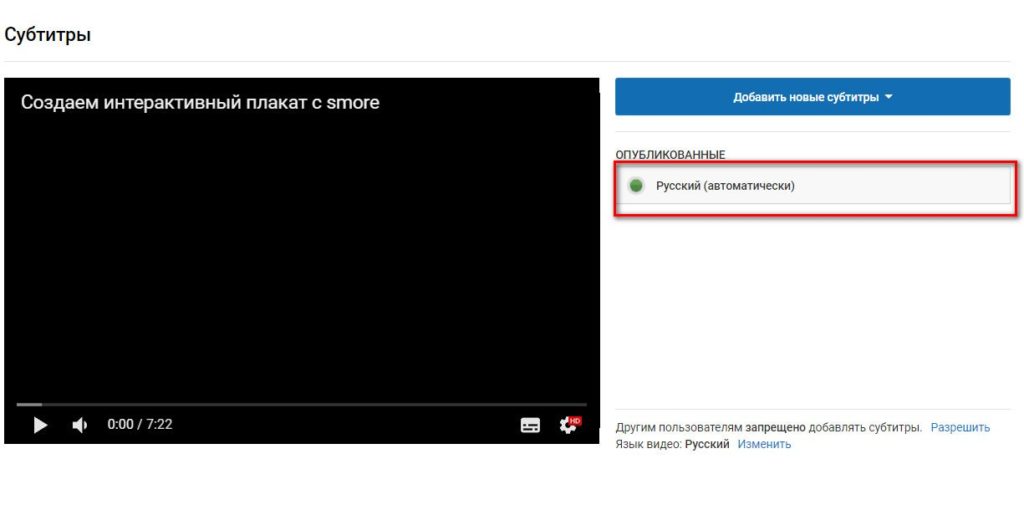 Б) Нажмите на кнопку «Добавить новые субтитры» и выберите язык видео. Таким образом мы создаем автоматические субтитры, которые грешат рядом неточностей.