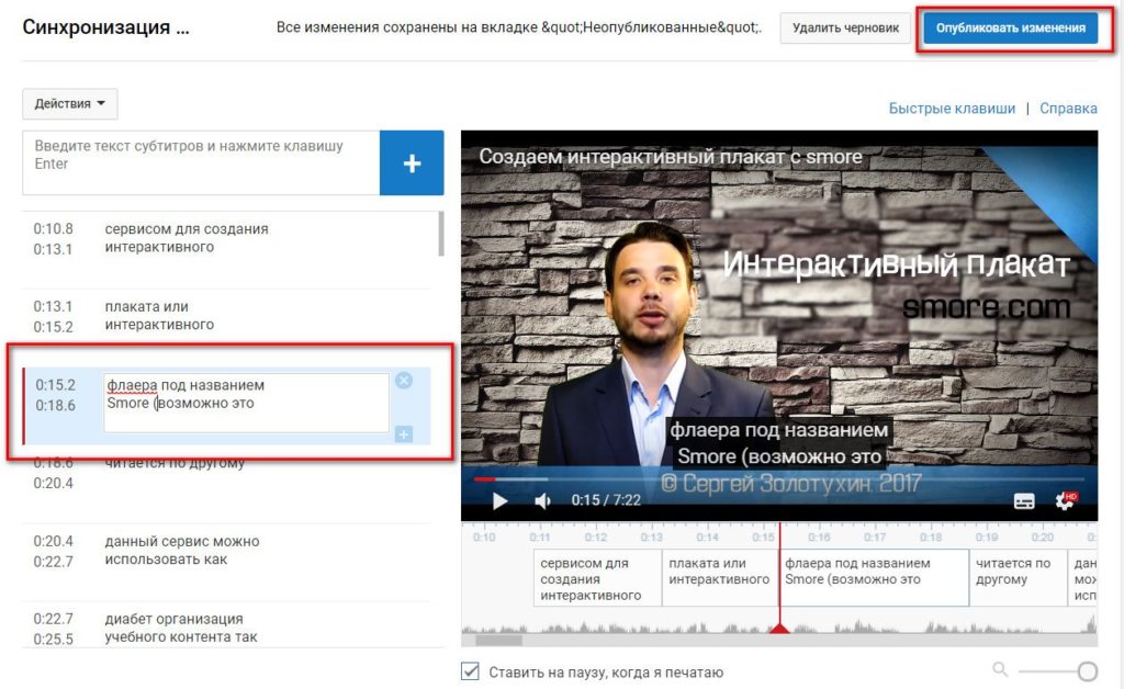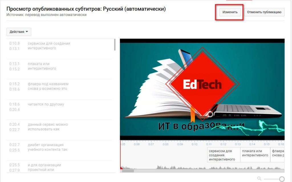 Д) Нажимаем на кнопку «Изменить» и в режиме реального времени правим субтитры.