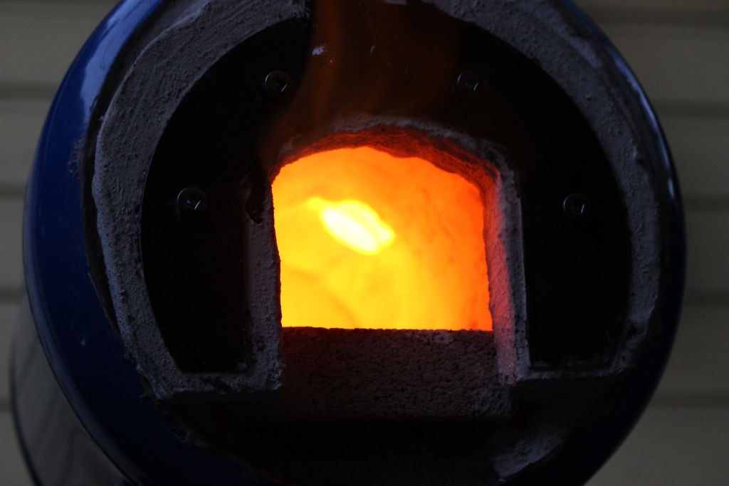 Наденьте защитные очки и поставьте рядом огнетушитель. Чтобы разжечь пламя, используйте специальную длинную зажигалку для гриля и поднесите огонек прямо к отверстию с трубкой горелки. Медленно открывайте вентиль подачи газа, в горне должно появиться пламя. Пока оставьте маленькое пламя.