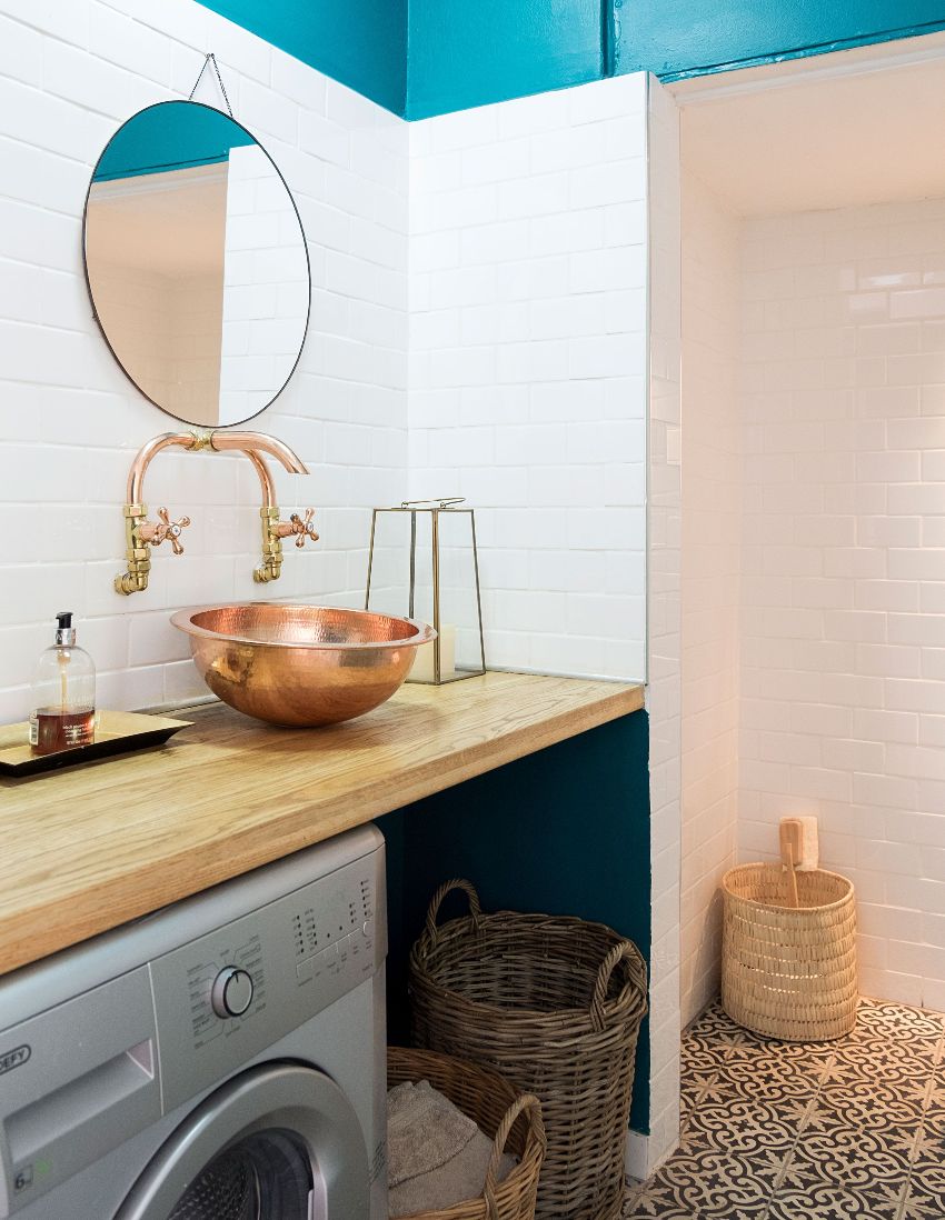Разместив раковину и машинку под одной столешницей, можно сэкономить пространство небольшой ванной