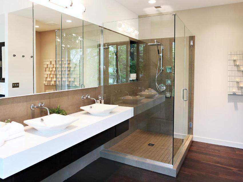 Такая конструкция в ванную комнату должна быть не только эстетичной, но и стойкой к воздействию влаги и плесени. Современные технологии позволяют добиться этих параметров.