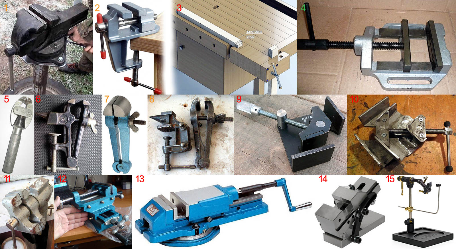 А вот с угловыми тисками (поз. 9) для зажима деталей, соединяемых под углом, дело, как говорится, глухо. Сделать их подобие своими руками возможно (поз. 10), но, во-первых, оказывается, что обеспечить зажим уже под фиксированным углом точно 90 градусов очень сложно, а если удалось, то угол потом быстро «плывет». О самодельных угловых тисках с регулируемым углом зажима и говорить не стоит. То же касается 2-3 координатных ручных станочных тисков (поз. 11-14) и, напр., приспособлений для вязания рыболовных мушек (поз. 15), которые уже не тиски, а узко специализированный станок.
