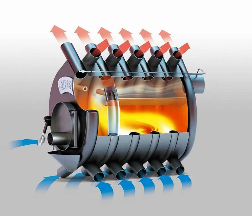 Конвекционная печь для отопления представляет собой цилиндрическое устройство из металла, с вваренными в ее корпус трубами, ориентированными вниз и вверх. Принцип ее работы заключается в том, что нагретый от корпуса воздух, поднимается по трубам вверх, а холодный воздух, тем временем, подсасывается нижними трубами с пола. Тем самым обеспечивается непрерывная мощная циркуляция воздуха в помещении.