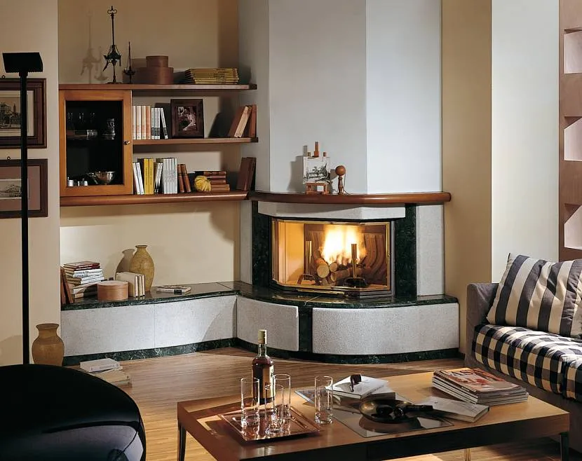 Настоящий или электрический камин – отличное решение для гостиной, где требуется рационально заполнить пустующий угол. С этим интерьерным элементом гарантированы уютные романтические вечера. В целях пожарной безопасности, вблизи камина (на расстоянии 50-80 см) не должно быть никакой мебели или комнатных растений.