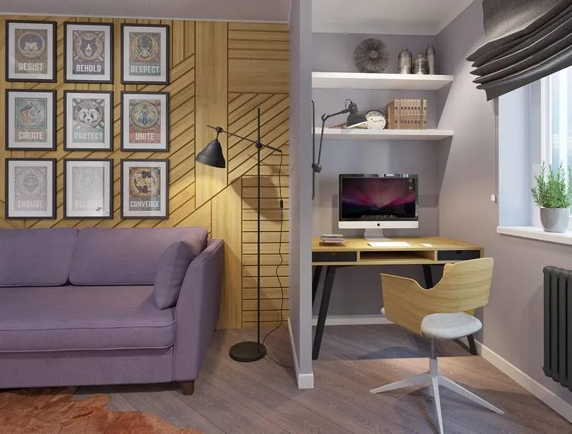 Угол гостиной занят маленьким компьютерным столиком, стулом и полкамиИсточник remontnik.ru