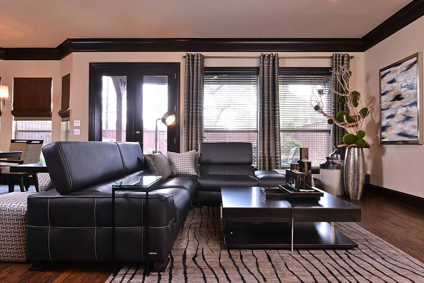 Каминная топка контрастной отделки отлично подходит стилю гостинойИсточник lunev-design.ru