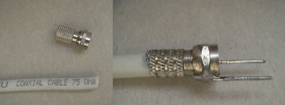 Самодельный усилитель сигнала подключают к высокочастотному кабелю методом пайки. Это говорит в пользу меди как самого подходящего металла для вибратора, однако применение канифоли позволит оплётка не каждого высокочастотного кабеля. Проблема пайки решается размещением на проводе F-коннектора.