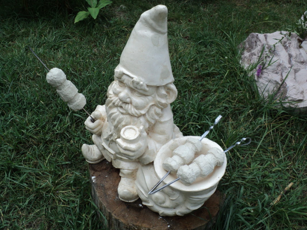 Когда цемент высохнет, снимаем гнома и сверху полируем более жидким раствором цемента с гипсом. Ждем когда гном высохнет – можем тонироватьили красить. Симпатяги, не правда ли?