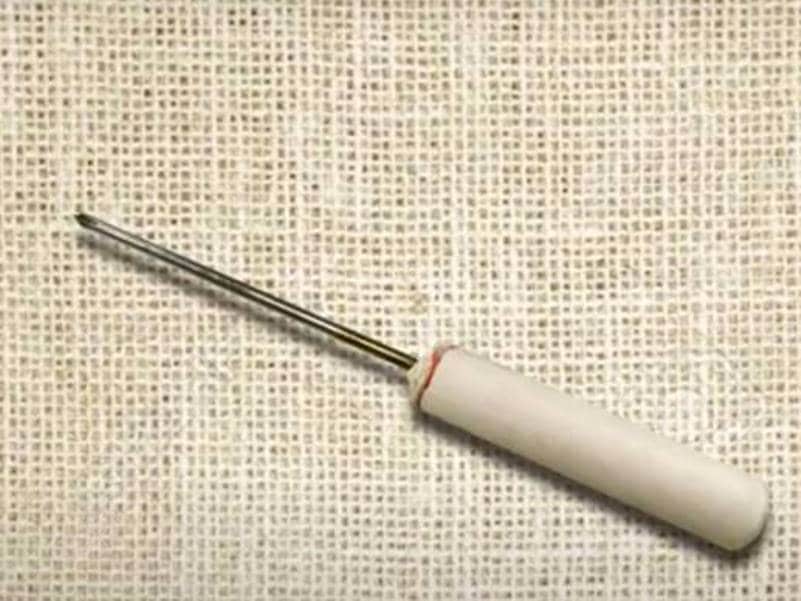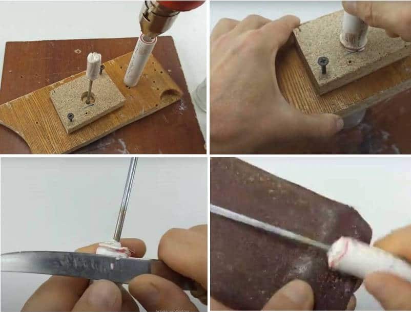Размечаем заготовку по внутреннему диаметру трубки для ручки. Далее пластиковое утолщение нужно обточить на токарном станке или с применение дрели. Если используем дрель, то ее необходимо закрепить к доске в горизонтальном положении. Шток отвертки зажимаем в патроне дрели. Организуем подкладку для импровизированного резца из ножа. В результате обработки диаметр утолщения из ПВХ должен быть на 1 мм больше диаметра внутреннего отверстия в трубке.