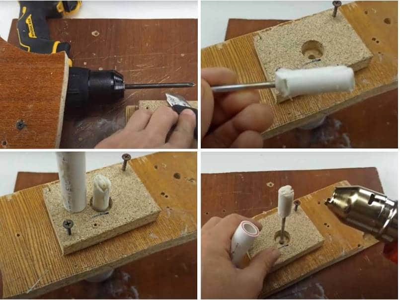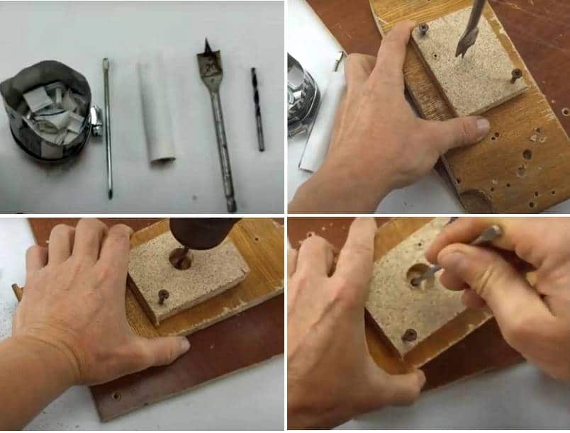 Для сборки отвертки изготовим оправку из двух дощечек толщиной 16-20 мм, которые наложены друг на друга и скручены саморезами. В верхней из них сверлим отверстие диаметром 20 мм, а затем в нижней сверлим отверстие, для стержня. В большое отверстие вставляем отрезок трубки ПВХ.