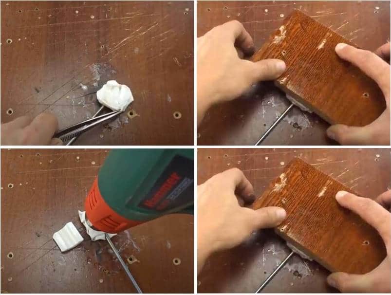 Зачем последовательно разогреваем еще два кусочка ПВХ, накладываем на склейку со стержнем и зажимаем между досок. Дожидаемся полного остывания сборки.
