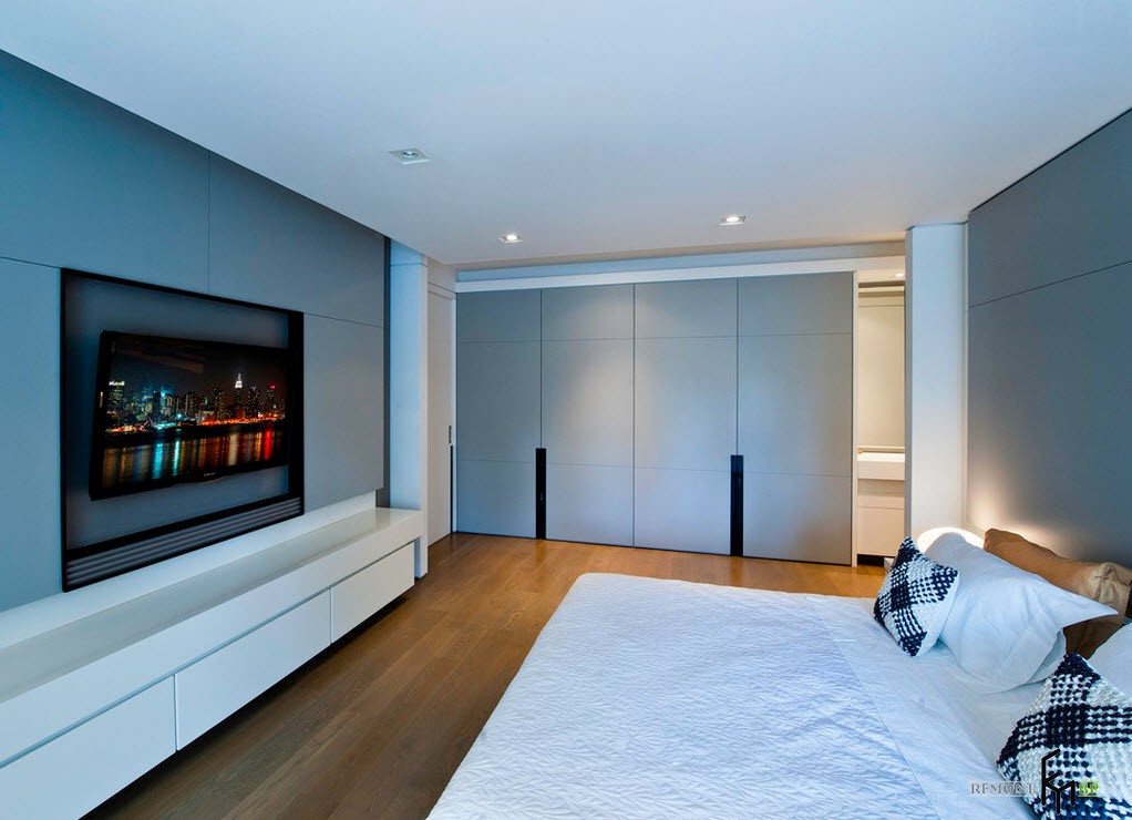 Плазменную панель можно расположить и между шкафов. Такой вариант подойдет для ценителей минимализма. Меньше полок, всяких деталей и только четкая лаконичная стена, поделенная на секции и с дверцами на механизме, избавляющем фасады от лишних ручек. Минимум контрастов и дополнительных элементов сделают гостиную идеальной.