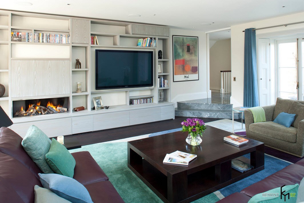 Экран, вмонтированный в мебель – прекрасная идея сделать комнату не только комфортным местом для увлекательного отдыха, но и функциональной зоной. Так, например, телевизор можно поместить среди книжных полок. При таком подходе даже объемный монитор станет второстепенным акцентом в интерьере. Это отличное решение для любителей классического стиля, когда больше хочется, чтобы центральным местом в гостиной был тот самый камин.