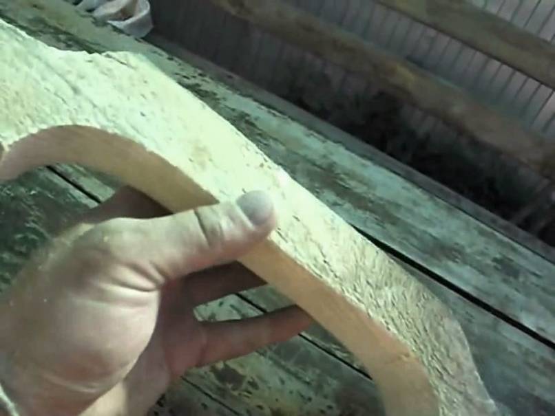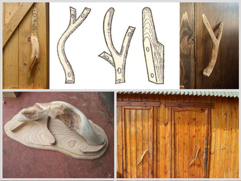 - Ручки в форме дуги , прибитой к дверному полотну. Корпус может быть вырезан из массива, ветки или корня дерева. Наружную поверхность традиционно украшают резьбой по дереву;