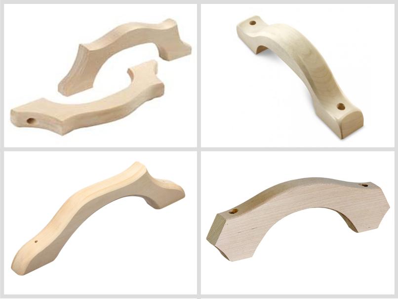 Плоские ручки наиболее популярны, а делают их из доски. Рекомендую вариант, расположенный на фото справа внизу: он наиболее надежен, так как проем ручки находится ниже головок шурупов. В этом случае поделка не сломается вдоль волокон.