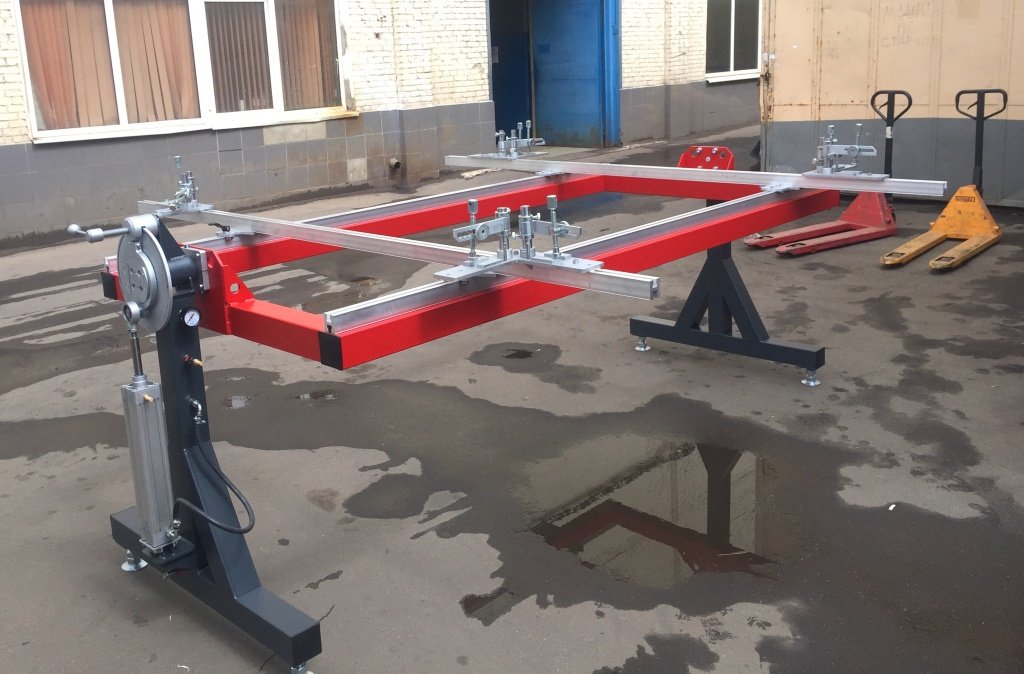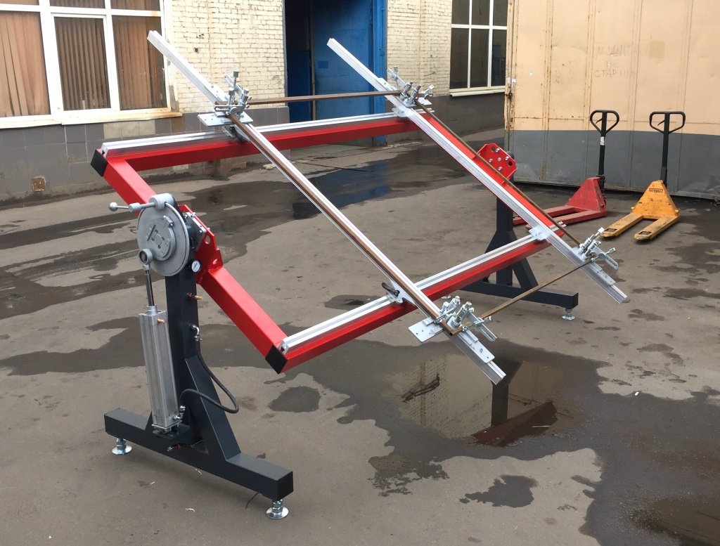 Металлоконструкция имеет две конусообразные опоры по бокам, между которыми фиксируется крутящаяся плоскость. На последней имеются регулирующиеся продольные балки, с рядом винтовых прижимов. Благодаря многочисленным отверстиям в балках, прижимы можно устанавливать по всей длине, в зависимости от размера изделия. Благодаря разводу или сведению самих балок регулируется ширина собираемой конструкции.