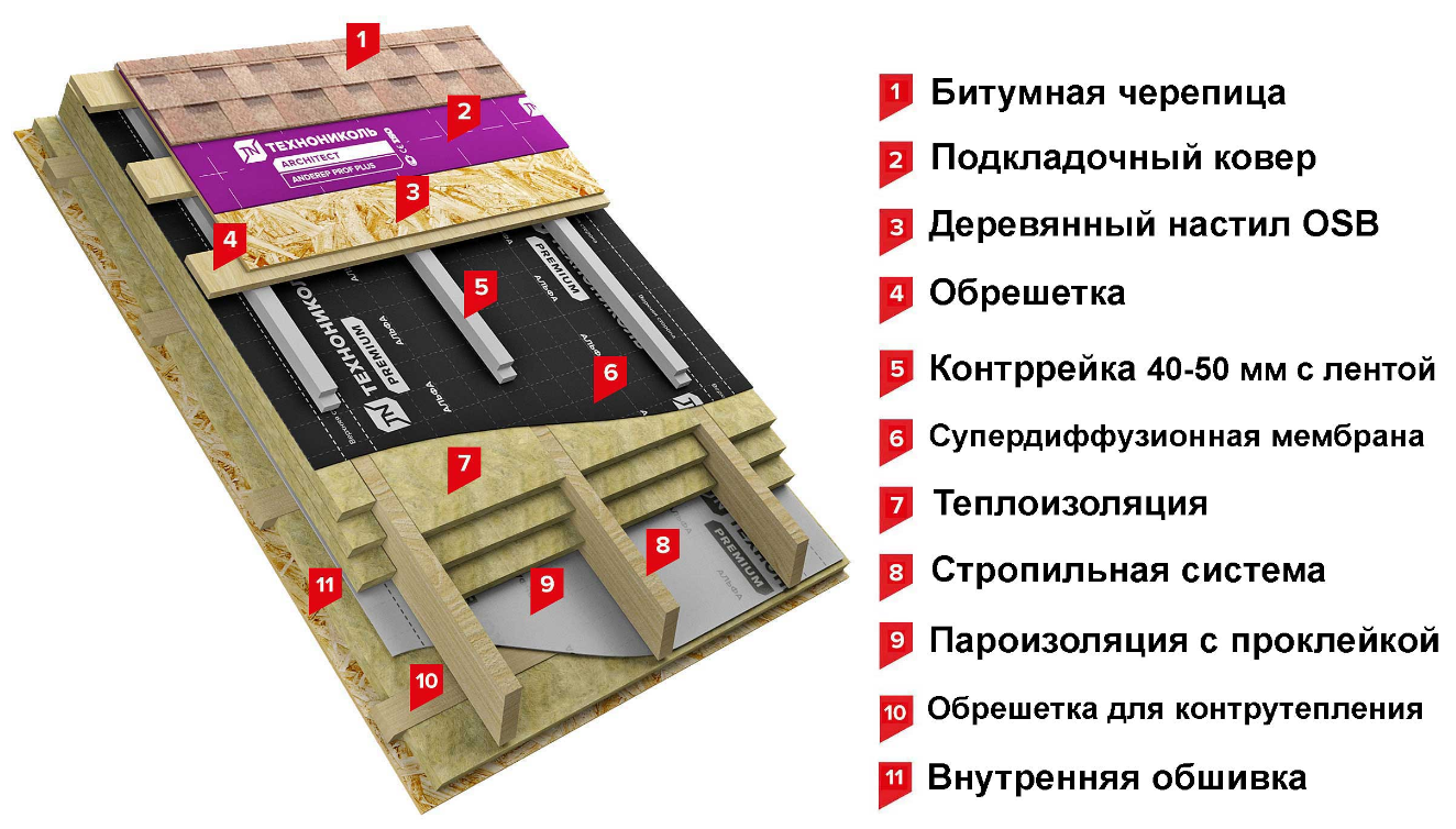 В качестве основания под черепицу используют сплошной материал. Пирог может включать сплошную обрешетку или разреженную с последующей укладкой на нее влагостойкой фанеры. Монтаж непосредственно на утеплитель запрещен.