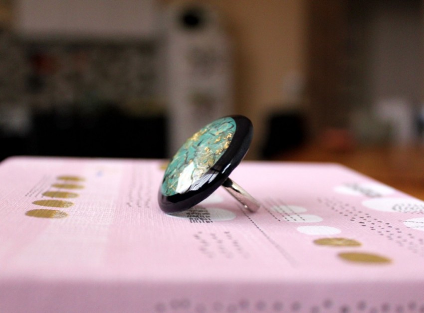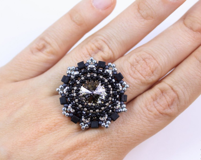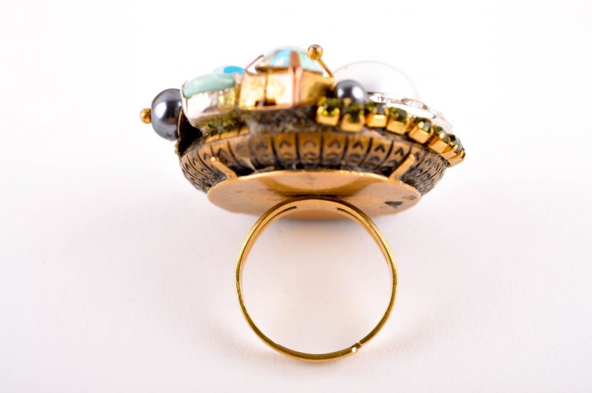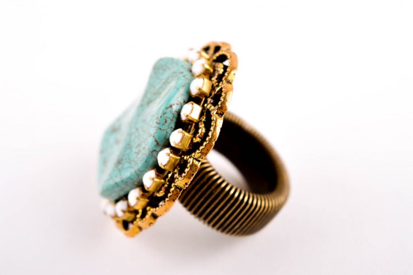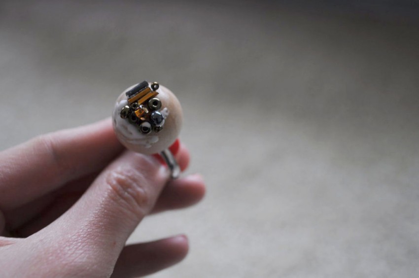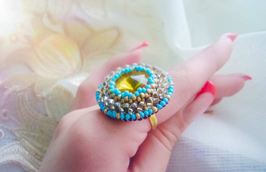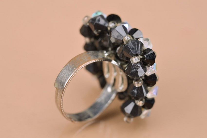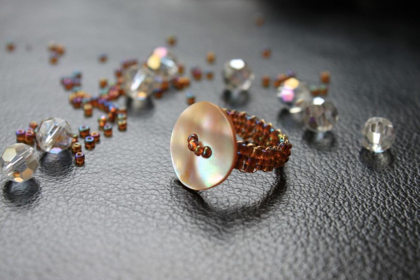 - Для декорирования кольца подберите не крупную (по ширине изделия) бусину или просверленный по центру камешек.