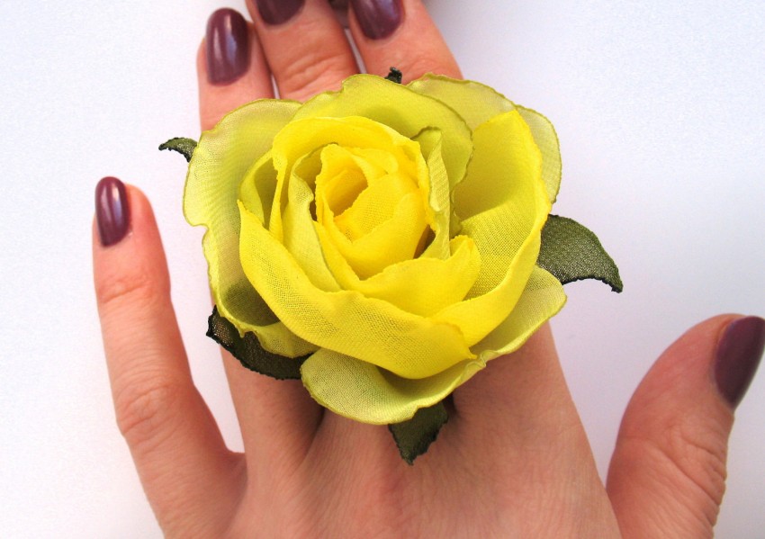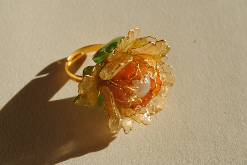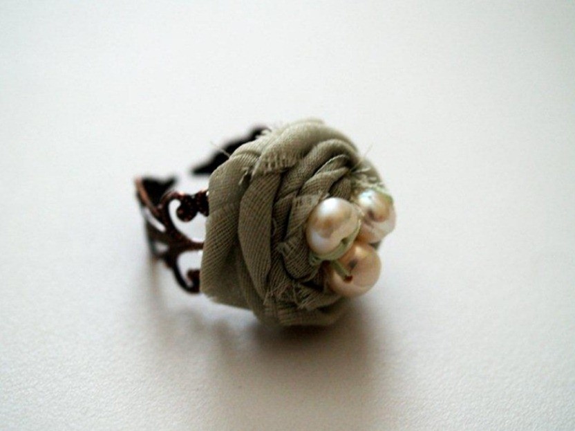 Возьмите ленту другого цвета и сложите ее пополам в длину. Приклейте один конец ленты к кольцу. Сложите ленту в форме розочки: для этого укладывайте ленту вокруг жемчужины, все время перекручивая ее. Свободный конец спрячьте и закрепите при помощи клея.