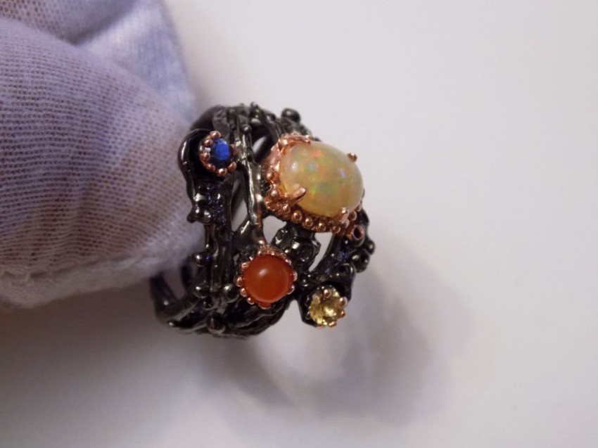 - Для украшения кольца и фиксировании элемента декора (камня) можно использовать дополнительную проволочку с капельками на концах. Сделать капельки можно с помощью газовой горелки. Проволочку с капельками обмотайте вокруг камня (бусины), а затем еще обмотайте двумя концами основу кольца, и выведите концы наружу. Красиво изогните, чтобы придать изделию изысканности.