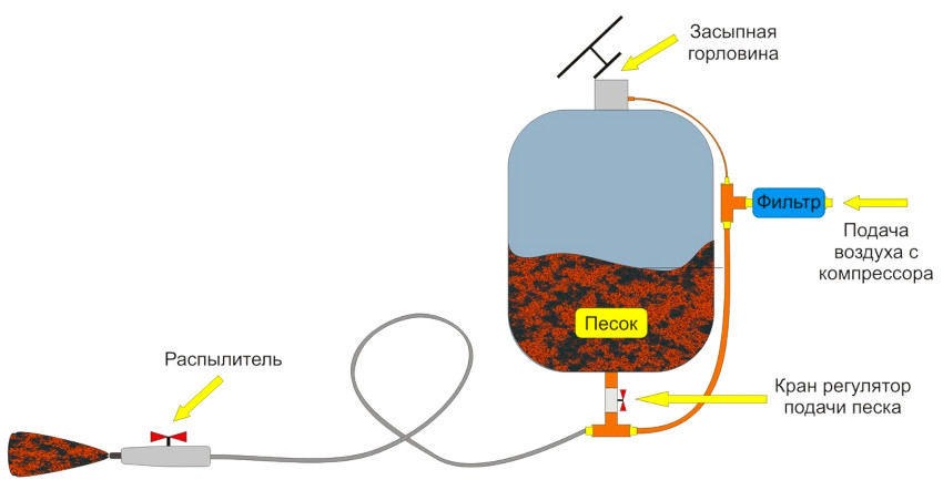 Рассмотрим самый простой вариант сборки пескоструйного аппарата. Схема выглядит примерно следующим образом: