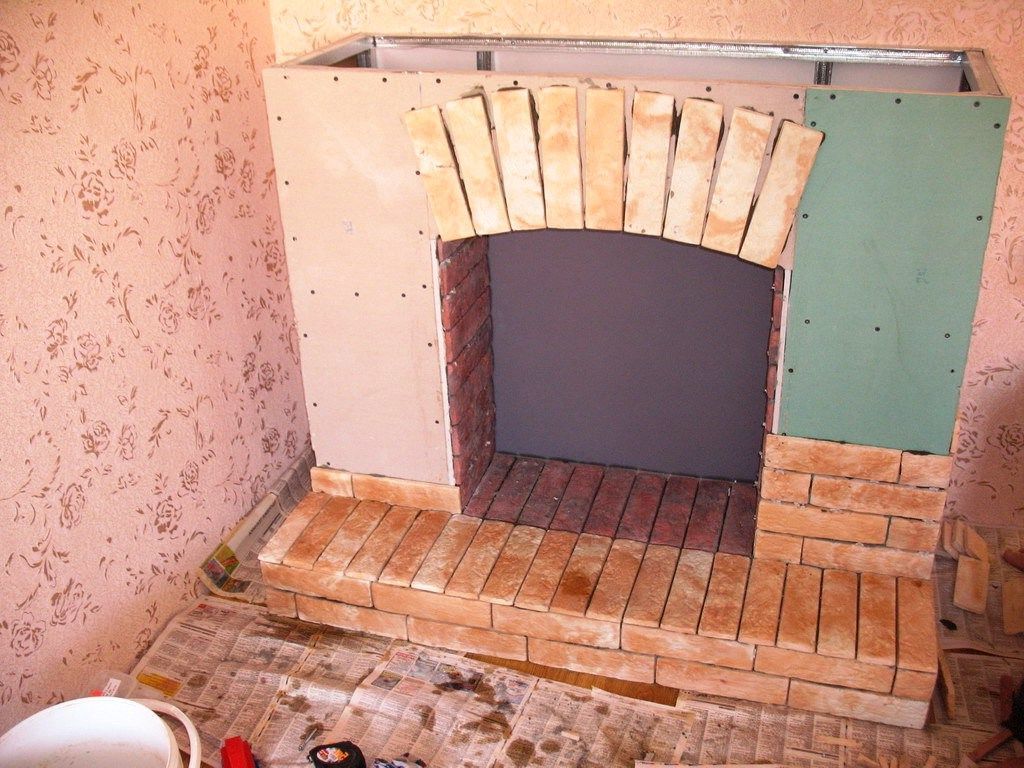 Размеры каркаса переносят на листы гипсокартона, вырезают детали. Их крепят к каркасу саморезами, углы обклеивают серпянкой. Швы нужно зашпаклевать, конструкцию отделывают выбранным материалом. Затем сверху помещают столешницу и подключают электрокамин. Портал можно покрыть слоем штукатурки и окрасить белой краской. Деревянная светлая полка дополнит сооружение в стиле кантри. Если нужно покрыть камин плиткой, то его предварительно грунтуют и крепят материал на жидкие гвозди.