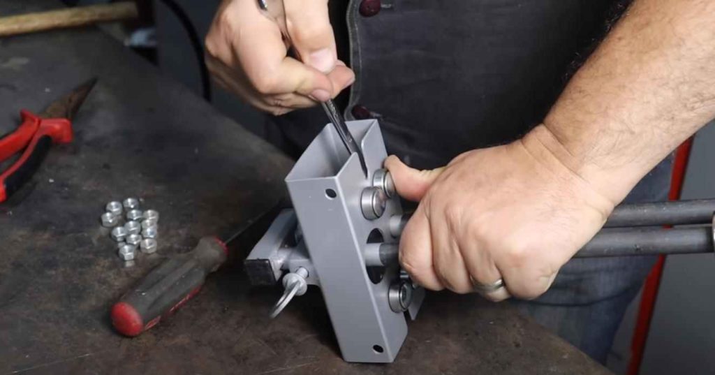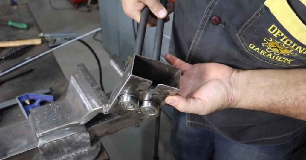 В приваренных профильных трубах нужно будет просверлить два отверстия для установки стальных кругляков, на которые в дальнейшем будут надеваться прижимные подшипники.