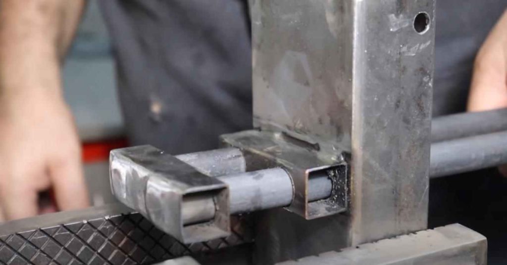 Далее необходимо отрезать два кусочка квадратной профтрубы. Фиксируем их между собой с помощью сварки (на прихватки). Привариваем к корпусу.