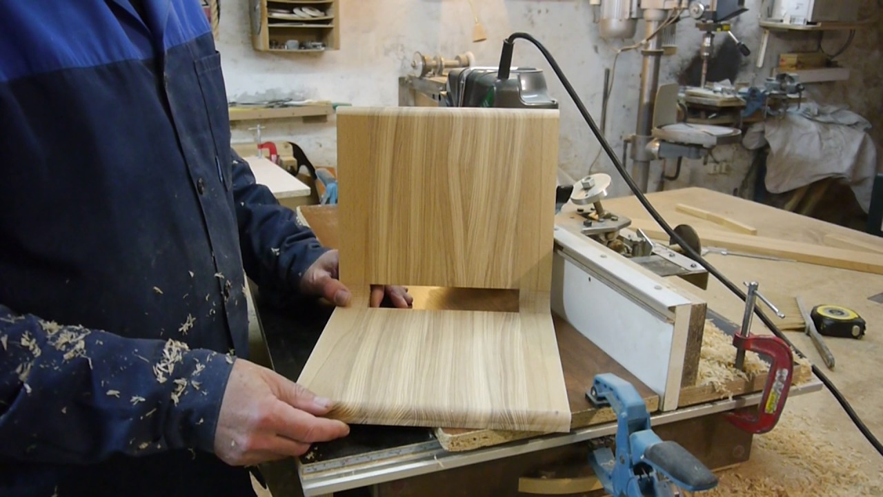 По два элемента обеих ножек склеивают и оставляют сушиться. На внутренней поверхности стоек после полного их высыхания проделывают пазы, пользуясь фрезером.