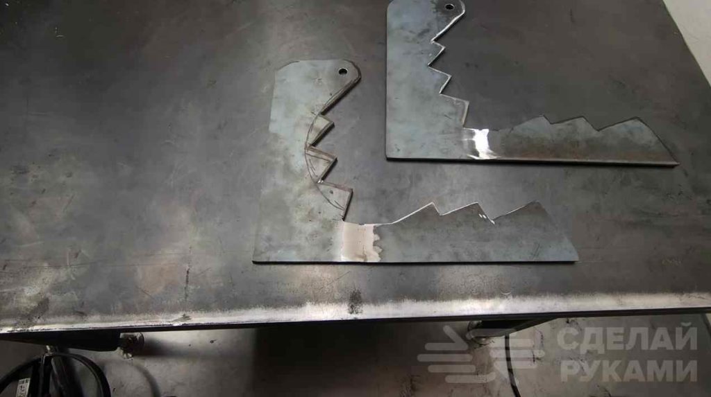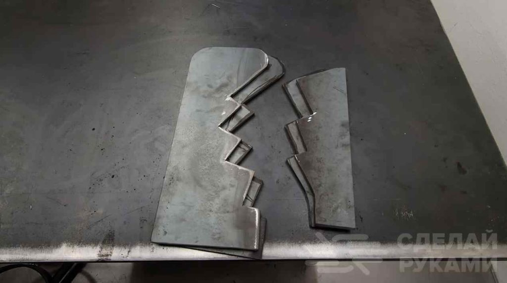 Сначала из металлического листа необходимо будет вырезать болгаркой четыре заготовки «со ступеньками».