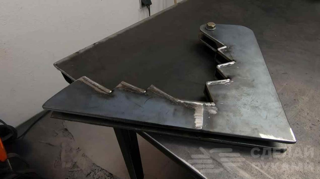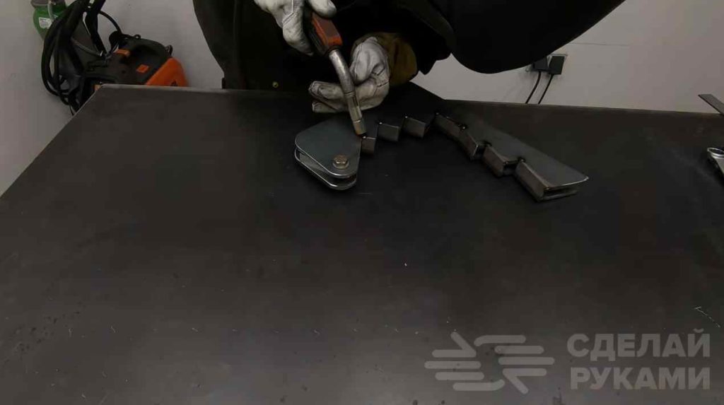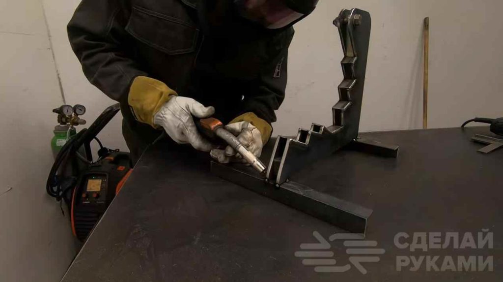 По бокам стойки привариваем две металлических пластины. Затем зачищаем самоделку болгаркой и красим.