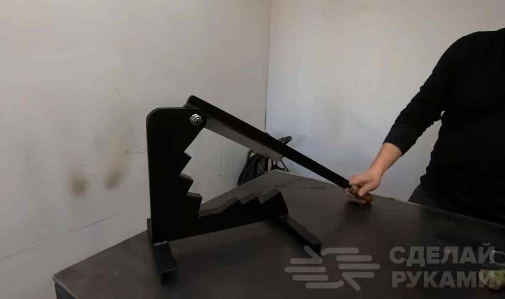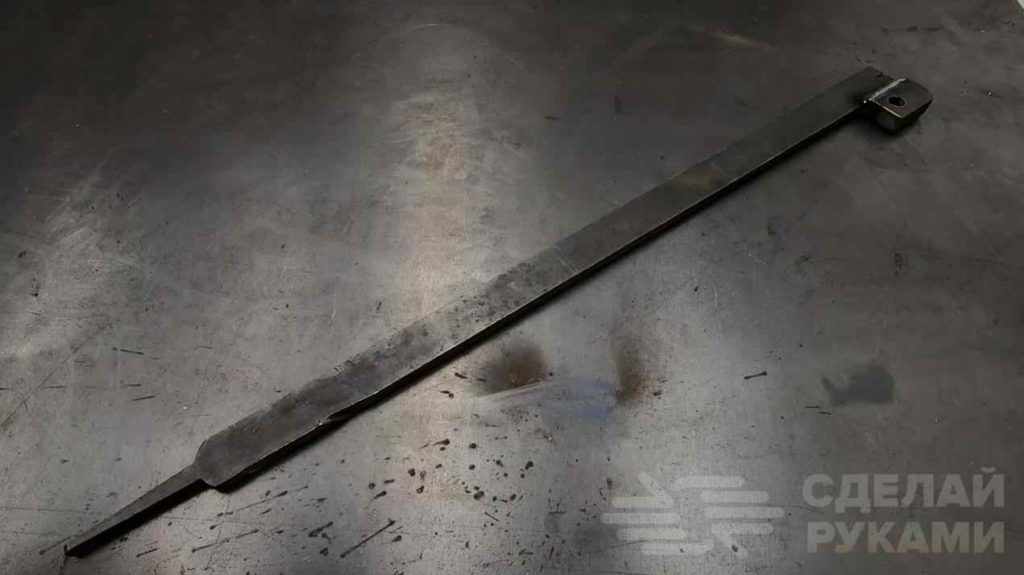 Из куска металлической полосы автор делает ручку щепокола. Привариваем к ней крепление с отверстием, чтобы можно было соединить с корпусом.