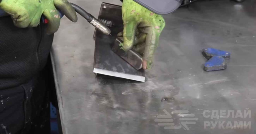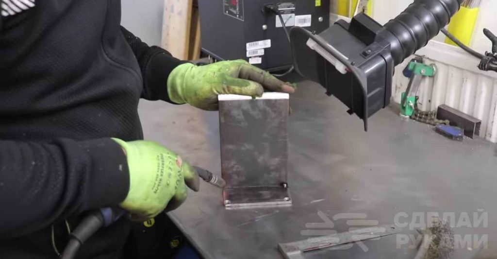 После этого надо будет приварить стойку к основанию щепокола, выставив ее под прямым углом — очень удобно использовать для этого магнитные уголки.