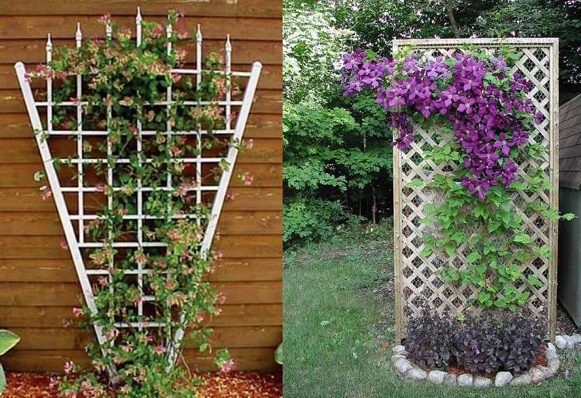 2Чтобы клематис смог охватить шпалеру, диаметр опоры не должен превышать 1-2 см. Но чтобы выдержать подобный вес, решетку необходимо делать достаточно частой.