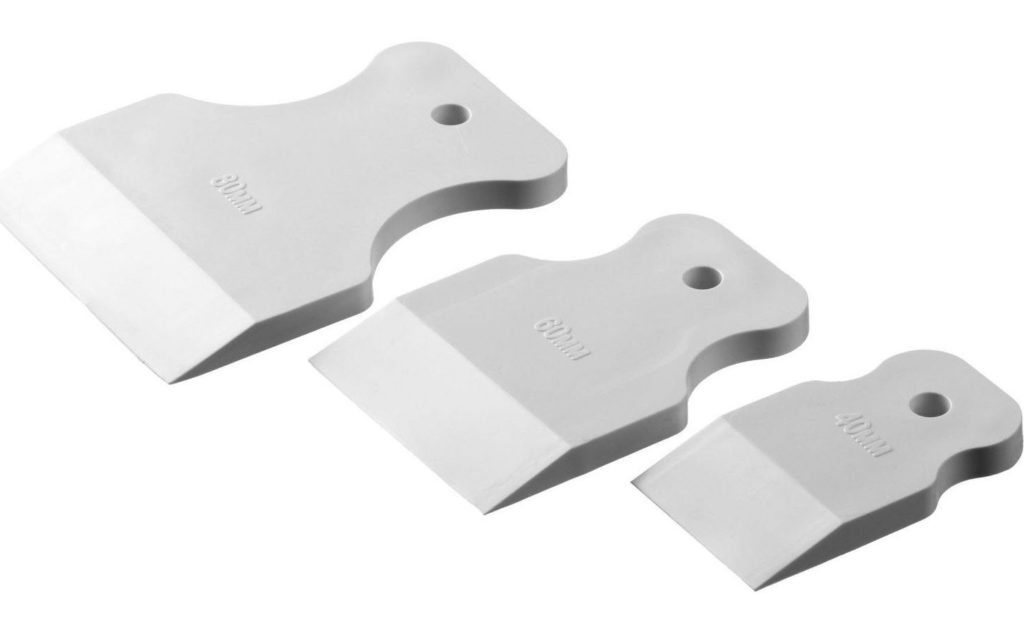 Наиболее популярен среди профессионалов и начинающих мастеров резиновый шпатель для затирки щелей между элементами отделки. Эти инструменты изготавливают из прочного и в достаточной степени эластичного материала. В магазинах продают комплекты, состоящие из двух, трех и более шпателей разных размеров. Цвет может быть любым, но наиболее часто встречается белый, серый и черный. Форма прямоугольная или трапециевидная.