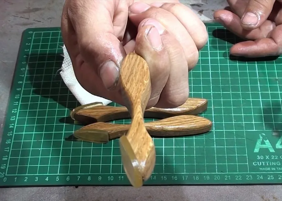 В качестве инструмента рекомендую использовать куски тонкой фанеры, разрезанные в нужных размерах. Если есть токарный станок, то самодельный шпатель можно выпилить из бруска дерева. Для рукоятки подходит древесина, наконечник вырезаю из сапожного полиуретана. Готовые детали соединяю клеем.