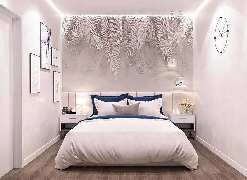 Фотообои с листьями в спальне без окнаИсточник a-r-s.ru