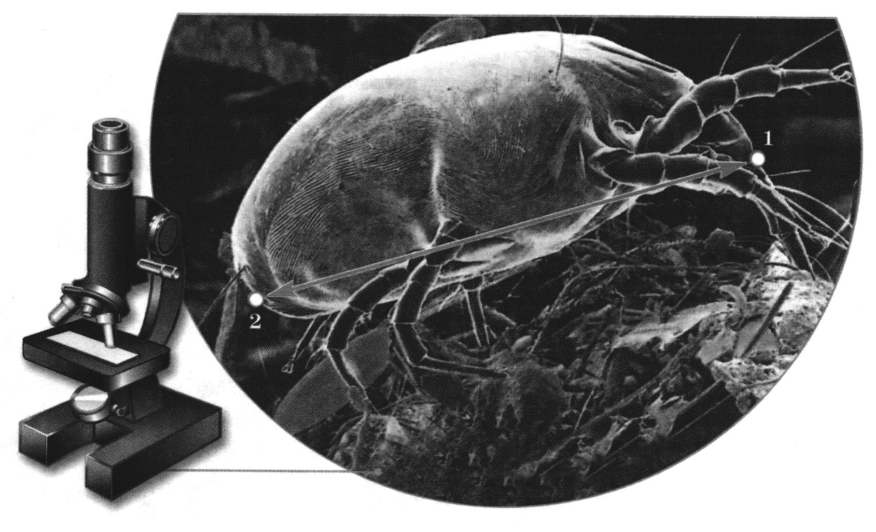 4. Приложите линейку к фотографии, полученной с помощью современного оптического микроскопа. Измерьте размер пылевого клеща на фотографии (расстояние между точками 1 и 2).