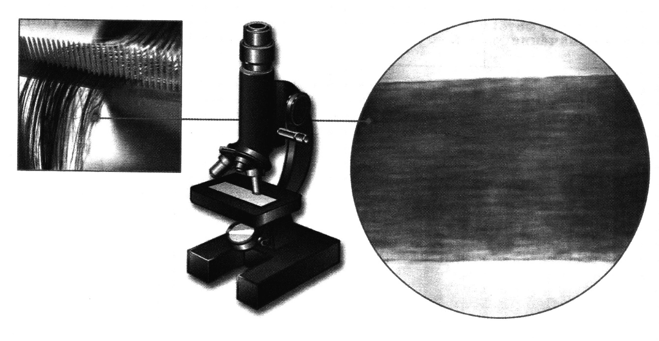 1. Приложите линейку к фотографии, полученной с помощью оптического микроскопа. Измерьте диаметр человеческого волоса на фотографии.