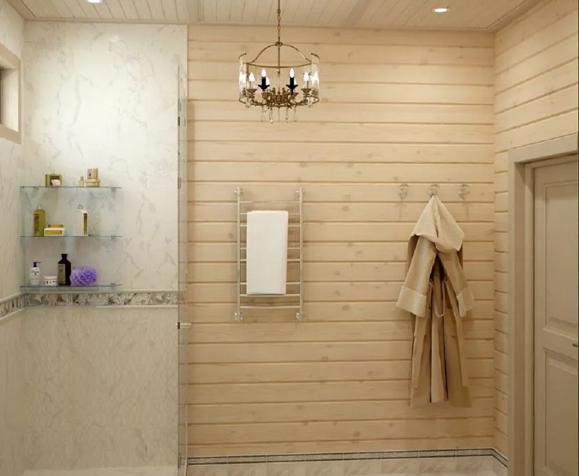 Среди альтернатив плитке в ванной профессионалы выделяют вагонку. Недорогие обшивочные доски монтируют на металлопрофильную обрешетку. Чтобы древесина не гнила, поверхность защищают антисептиком и водоотталкивающим лаком. Материал не стоит монтировать в душевой кабине или рядом с чашей. В мокрой зоне лучше использовать краску или стеклянный экран.
