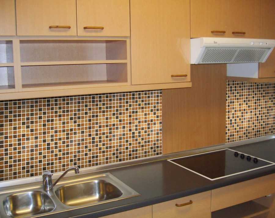Стены пусть пока подождут, а вот рабочие поверхности пора и подновить. Отделку выкладывают в любой форме, комбинируют цветовые, фактурные решения, сооружают мозаичные узоры – вариантов масса. Глядя на такую красоту, никто не подумается, что это «старый отслуживший» гарнитур, мебель выглядит совершенно иначе.