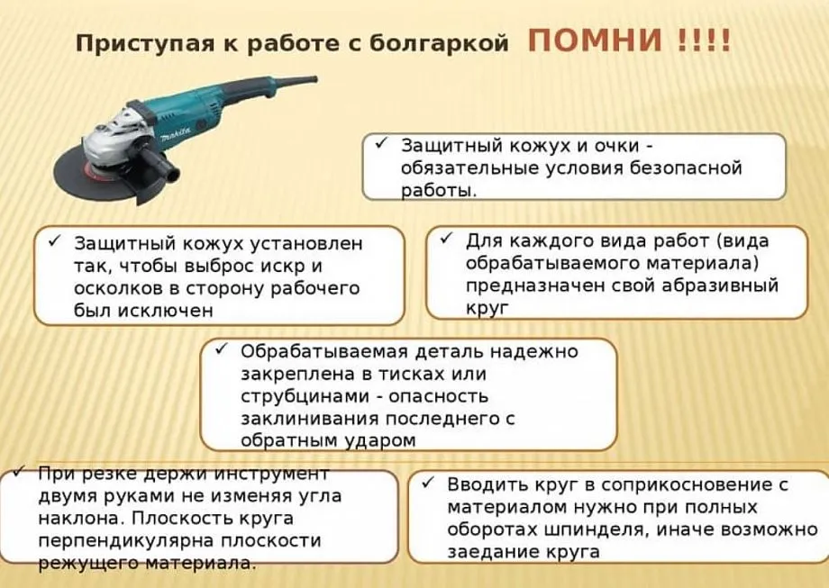 Болгарка чаще всего находится на весу в руках мастера и не имеет точки опоры, поэтому к процессу резки или полировке следует подходить предельно собранным и трезвым. Людям с неуравновешенной психикой или плохим здоровьем запрещено приступать к работе с УШМ.