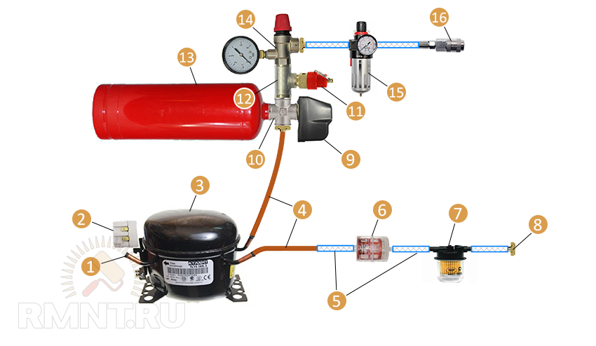 В качестве основных элементов берутся: мотор-компрессор от холодильника (лучше производства СССР) и баллон огнетушителя, который будет использован в качестве ресивера. Если в наличии их нет, то компрессор от неработающего холодильника можно поискать в мастерских по ремонту или в пунктах приёма металла. Огнетушитель можно приобрести на вторичном рынке или привлечь к поискам знакомых, на работе у которых могут быть списанные ОХП, ОВП, ОУ на 10 л. Баллон огнетушителя должен быть безопасно опорожнён.