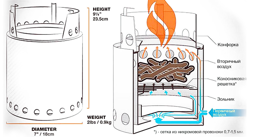 Печка с двумя стенками – это одна кастрюля, вставленная в другую. Сбоку нужно проделать отверстие для загрузки дров. В дне сделать щели, параллельно друг другу. На полученный колосник устанавливают подставку, которую нагружают дровами. Сверху ставят еще одну емкость размером поменьше, которая будет нагреваться от огня. Не забудьте изготовить съемную дужку для полученного котелка. Процесс приготовления пищи в данной печке будет весьма приятным и не затруднительным, а вот вкус блюда вас очень порадует.